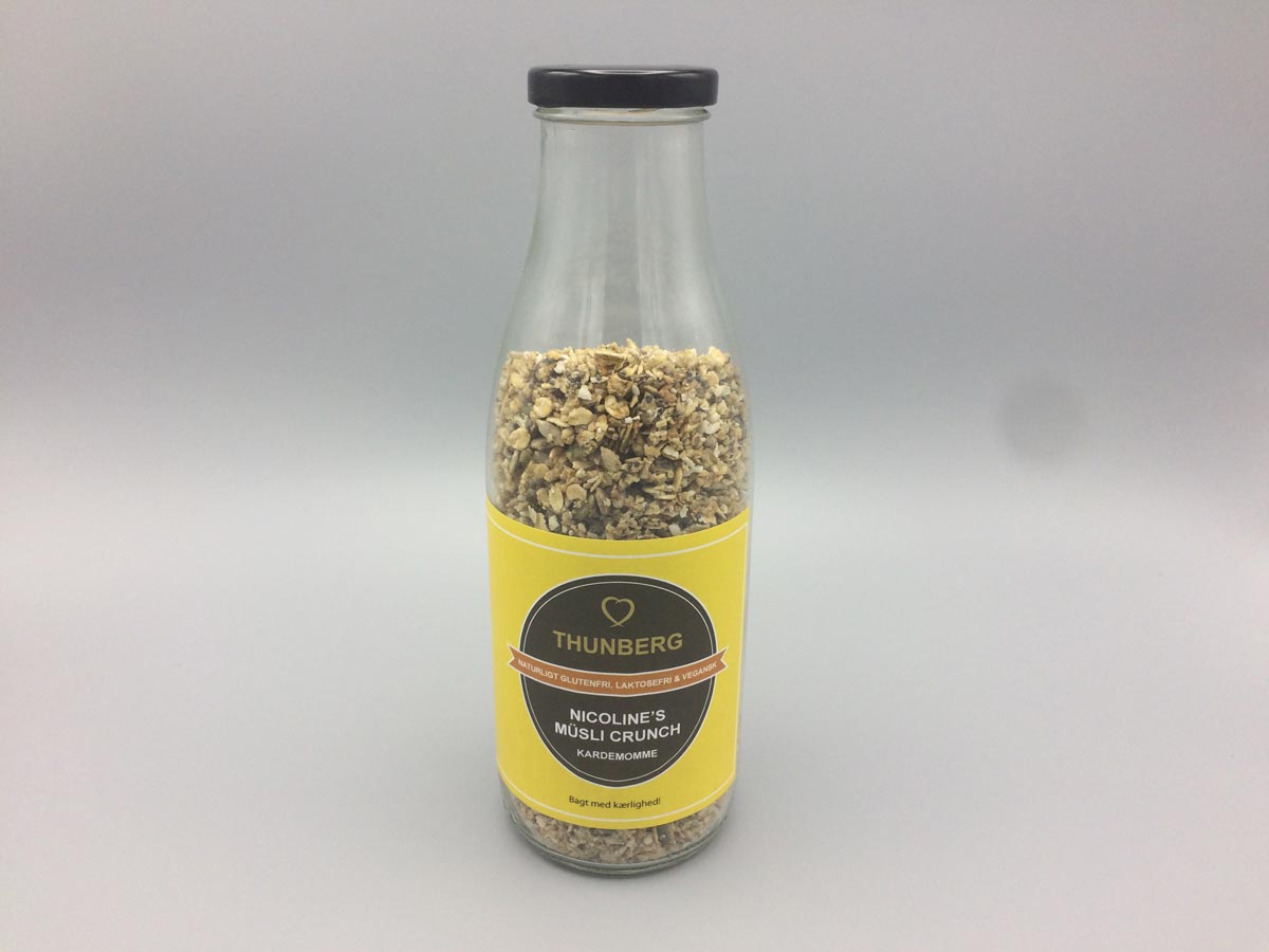 Dette har vi efter bedste evne forsøgt at imødekomme med vores nye naturligt glutenfrie Müsli Crunch m/kardemomme , den er iøvrigt også laktosefri og vegansk.